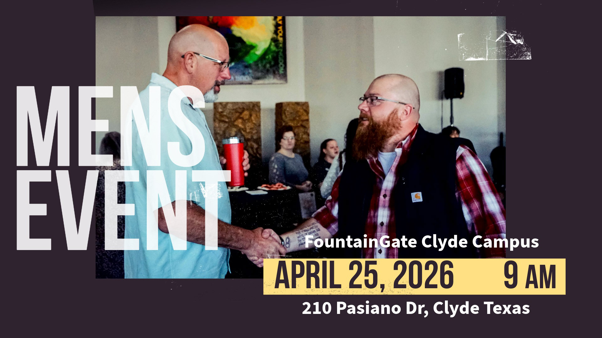 Join us for a Men’s Event on April 25th at FountainGate's Clyde Campus. We’ll have a meal, engage in meaningful conversations, and worship together. Afterwards, we will work on our new Clyde Campus Sanctuary to get it ready for its grand opening.